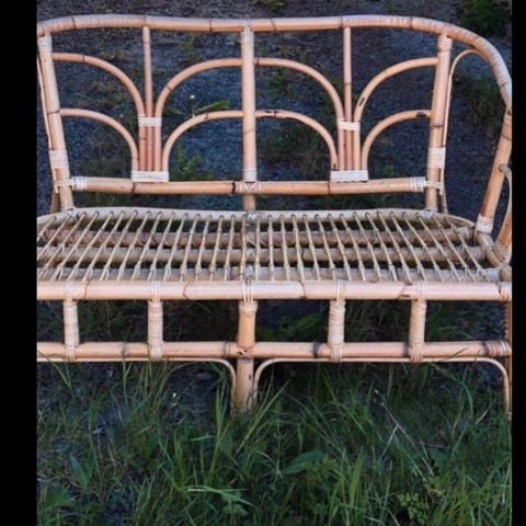 Fin rattan sofa i naturfarvet bambusflet, passer til to personer. Har buet ryg og sæde med tætte rør og let skrå ben, som giver et hyggeligt udtryk. Fineste fine eksemplar. Pris er ikke til forhandling