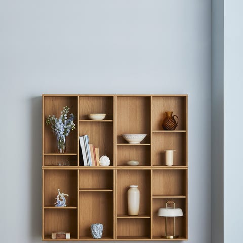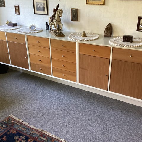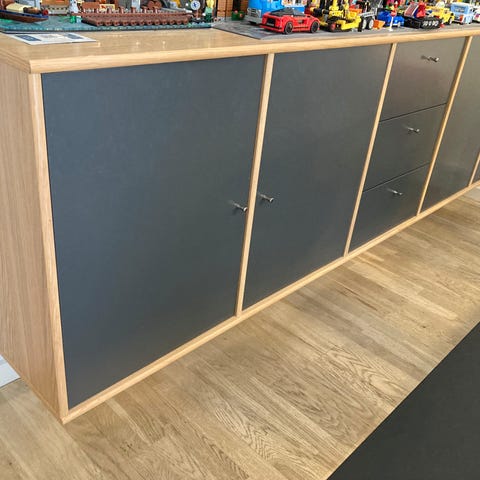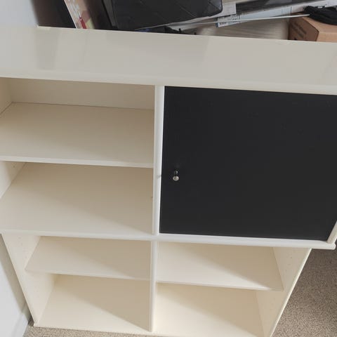 Mistral bogkasse med låg, åbne hylder og skabe sælges. Pæn og funktionel med almindelige brugsspor.