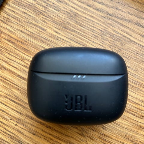 JBL trådløse in-ear høretelefoner i sort med lille ladeetui. Etuiet har hængslet låg og oplades via stik bagpå. Stik medfølger ikke.