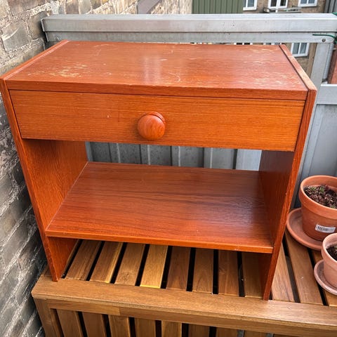 Flot og smukt natbord i teaktræ fra 1960’erne. Bordet fremstår i godt stand og klar til at hænge op på væggen.
