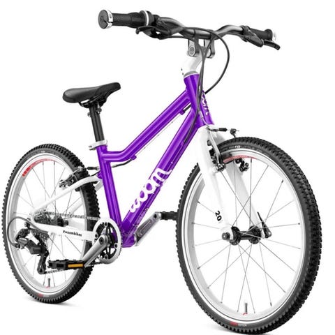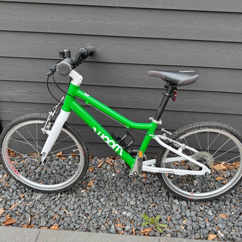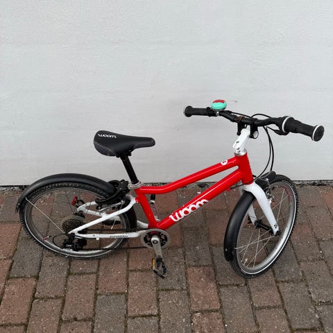Woom børnecykel med 20" hjul i orange med hvid forgaffel. Cyklen har 7 gear, støtteben, skærm og en godkendt ringlås.