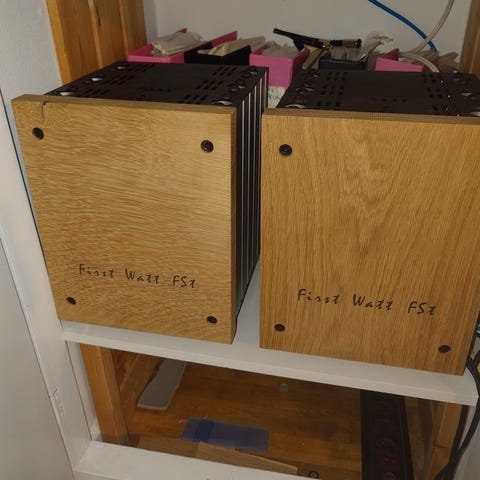 Flotte DIY FirstWatt F5 TURBO monoblokke med smukke træfronter med print i træet. På toppen er der skåret PASS i metallet.