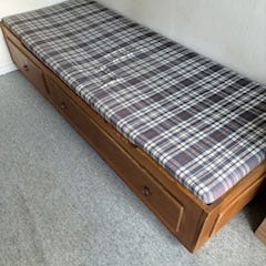 Virkelig flot feltseng/solseng i lækre materialer og flot udførsel. Teak og lærred. Fungere også fint som ekstraseng med en madras på.