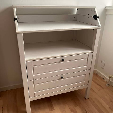 SUNDVIK hvidt puslebord i træ. Det er i pæn stand. Eneste tegn på brug er ved skufferne, som ses på billederne. Maks belastning 13,60 kg.