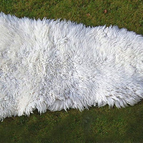 Dette er et stort læder skindtæppe, der måler 100x74 cm. Forsiden har en blød, fluffy overflade i en lys farve, mens bagsiden er glat og har nogle små mærker. Det kan bruges som tæppe eller dekoration i hjemmet.
