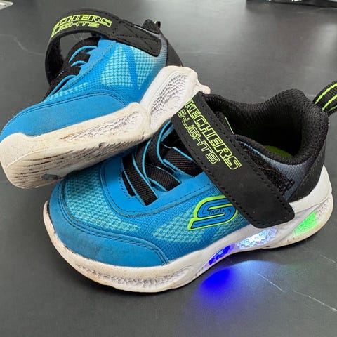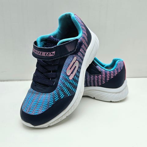 Disse sneakers har et leopardmønster med lyserød base og sort og flerfarvet detaljer. De har en hvid sål og elastiske stropper på toppen for nem påsætning. Den totale længde af skoen er 22 cm. De er velegnede til børn.