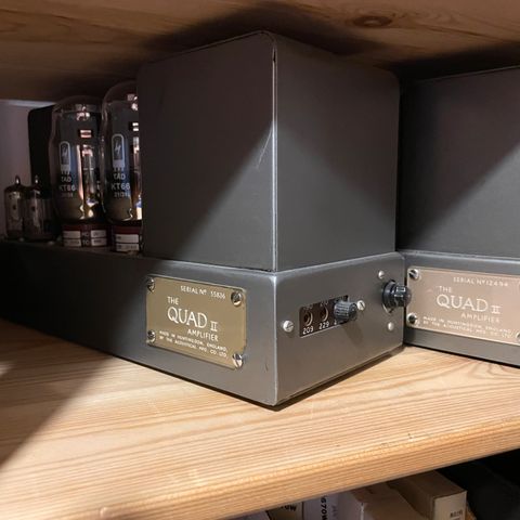 Radiorør i QUAD II er ligeledes nye og er NOS 4 stk TAD-KT66, 4 stk NOS EF86 Philips/Miniwatt NL, 2 stk NOS 5V4/GZ32 SYLVANIA Usa.
