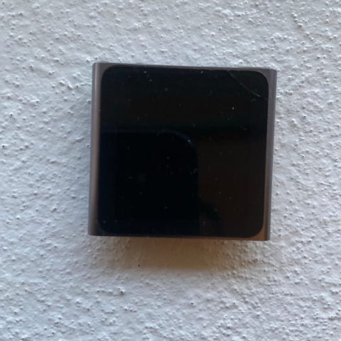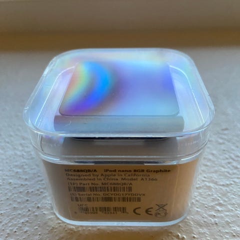 Apple iPod Nano musikafspiller med 8 GB hukommelse. Lille kvadratisk model med touchskærm og clip på bagsiden, ligger i den gennemsigtige æske som på billederne.