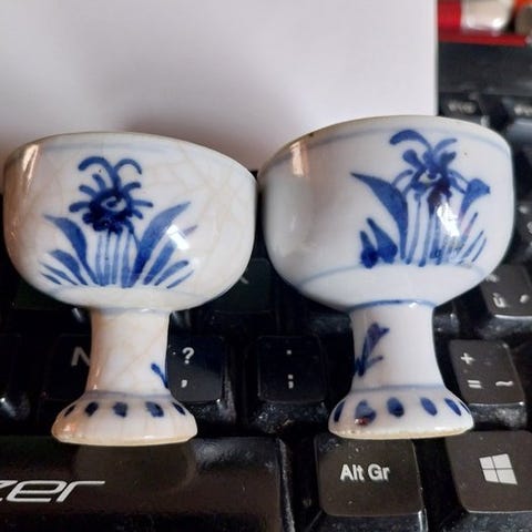 Kopdiameteren er ca. 8 cm, højden ca. 5,2 cm, i god stand med mindre skår i bunde, venligst tjek billederne omhyggeligt.