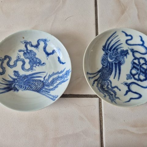 To sæt kinesiske blå- og hvide porcelænskopper og underkopper med blomsterdek...