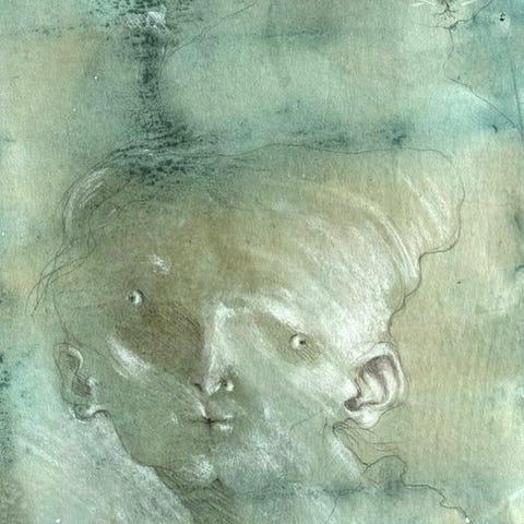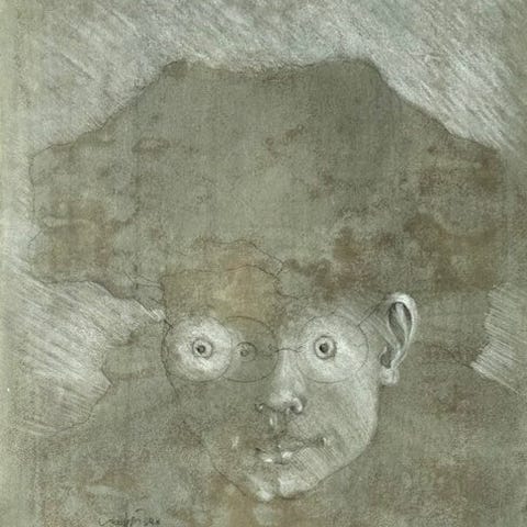 Teknik : Tegning i grafitblyant, kul, hvide højdepunkter og blå nuancer på forberedt papir med beige-grå struktur