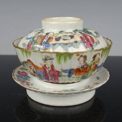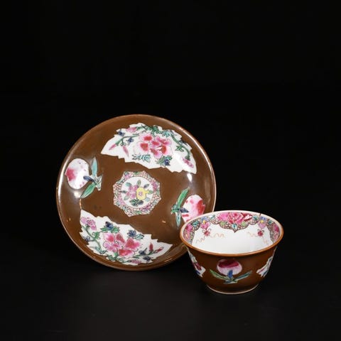 Detteforfinede sæt af tre japanske antikke te-seremoniestykker eksemplificerer den elegante æstetik i traditionelt japansk lak- og keramik-fremtræden. Sættet består af en tenmoku-te-bolge (chawan) dekoreret med teknelyse guld-fugl- og blomster-motiver (kinpaku tori-hana-mon), et lakbelagt låg (futa) prydet med makie arabesker (karakusa-mon), og en lakbelagt tenmoku-stativ (tenmoku-dai) også med indviklet makie arabeske-dekoration (karakusa-mon).