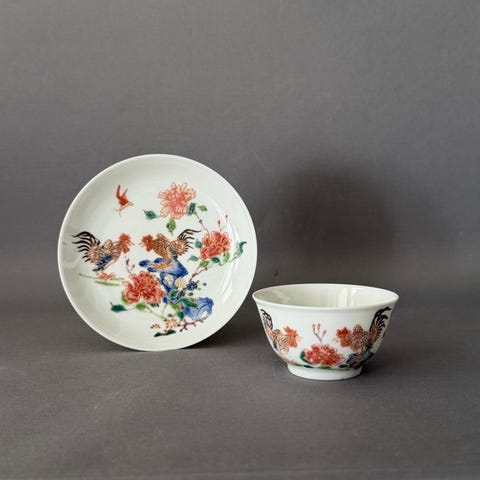 Originalt japansk Makie-lakkeret Tenmoku-te-sæt bestående af en chawan med gyldne fugle- og blomster motiver, et lakkeret futa-låg og et makie-dai-stativ, alle i god stand med den originale hakobako opbevaringsboks, fra 1900–2000 og lavet af lak på træ med guldudskæringer og gild ceramik. Klik på den blå "gå til varen" knap, for at købe eller byde på denne vare. Den samlede pris vil blive vist inden du afgiver dit bud.