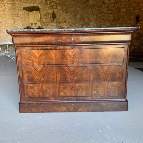 Materiale og detaljer: Kommoden er typisk lavet af valnød eller mahogni, ofte med dekorative inlays (marquetering) og snore på fronten af skufferne.