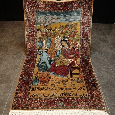 Pragtfuldt maskinfremstillet tæppe med et rigt detaljeret klassisk østligt design. Tæppet viser en elegant scene med en kvinde, fugle og florale motiver, udført i dybe farver som mørkeblå, rød og guldnuancer. Den dekorative kant og fine mønstre giver det hele et luksuriøst udtryk.