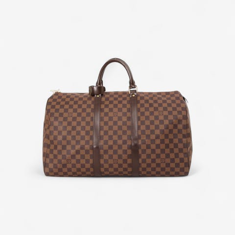 Elegant rejsetrolley af Louis Vuitton model Eole 50, fremstillet i den ikoniske Damier Ebene canvas med detaljer i mørkbrunt læder. Denne praktiske bagage kombinerer funktionalitet og stil, ideel til weekendophold eller forretningsrejser.