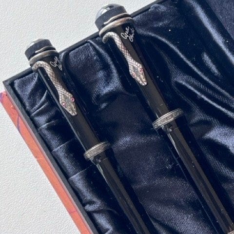 To Agatha Christie Limited Edition skriveinstrumenter fra Tyskland, dateret 2000-2010, lavet af 925 sølv og 18 kt guld, længde 137 mm, diameter 13 mm, i funktionsdygtig stand med mindre aldersrelaterede tegn. Klik på den blå "gå til varen" knap, for at købe eller byde på denne vare. Den samlede pris vil blive vist inden du afgiver dit bud.