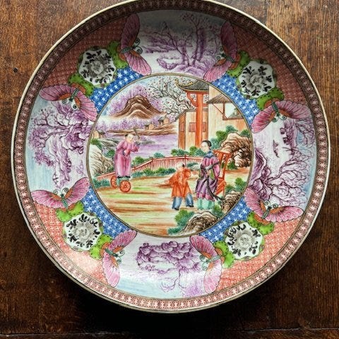 Qing-dynastiets exportporcelæn tallerken i Imari stil, blå og rød dekoration med blomster og fugle, diameter 23 cm, højde 3 cm, bredde 23 cm, oprindelse Kina, anslået periode 1750-1800, i god stand, brugt med små tegn på ældning. Klik på den blå "gå til varen" knap, for at købe eller byde på denne vare. Den samlede pris vil blive vist inden du afgiver dit bud.