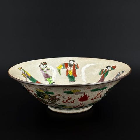 A famille rose-skål dekoreret med drage- og fjerne motiver.
