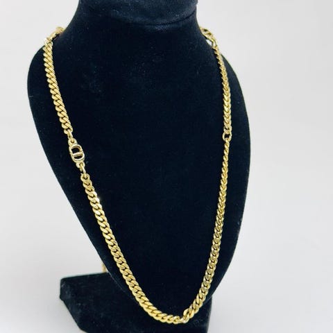 Guldfarvet stålhalskæde med sorte detaljer, 85 cm lang og 1 cm bred, brugt i fremragende stand. Klik på den blå "gå til varen" knap, for at købe eller byde på denne vare. Den samlede pris vil blive vist inden du afgiver dit bud.