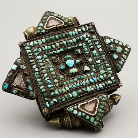 Stor ring fra Afghanistan fra anden halvdel af det 20. århundrede, lavet af sølv med koral og turkisel, dimensioner 7,5 × 5 × 5 cm (US størrelse 10¼) og vægt 85,1 g, i god stand og ægte. Klik på den blå "gå til varen" knap, for at købe eller byde på denne vare. Den samlede pris vil blive vist inden du afgiver dit bud.
