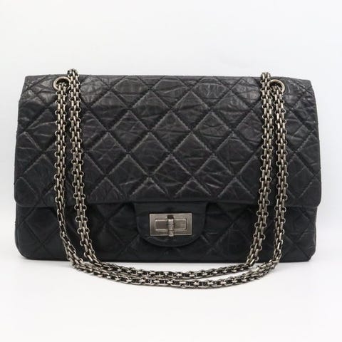 Ikonisk Chanel Reissue 2.55 i blødt ældet kalveskind i sort, med sorte metaldetaljer og klassisk diamantformet quiltning. Dobbelt klaffelukning, Mademoiselle-lukning med drejning, glidende kæde til båreb bæring på skulder eller crossbody og baglomme. Indvendigt med lynlåslomme og åbne lommer.