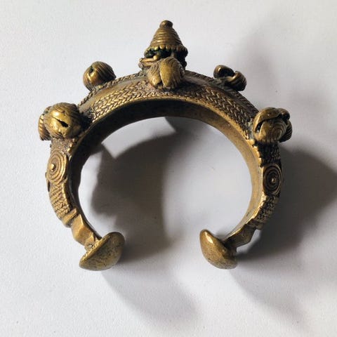 Et gammelt stamme-manchetarmbånd med bred, åben form, rigt dekoreret med håndgraverede svungne motiver. Designet er arrangeret i tre vandrette rækker, hver sat med tre ovale cabochon-stene, hvilket danner i alt ni indlæg.