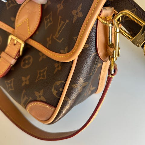 Brugt LV baguette vintage skuldertaske med én skulderrem, Chip-version, med tilbehør og skulderrem, viser tydelige brugsspor