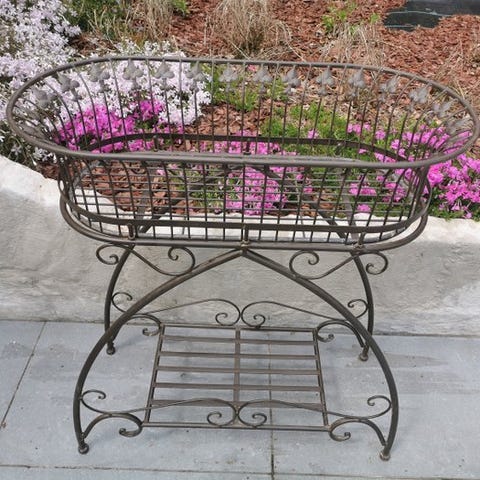 Smukt blomsterpotte af smedet jern fra Europa, 81 cm høj og 60×60 cm fod. Klik på den blå "gå til varen" knap, for at købe eller byde på denne vare. Den samlede pris vil blive vist inden du afgiver dit bud.