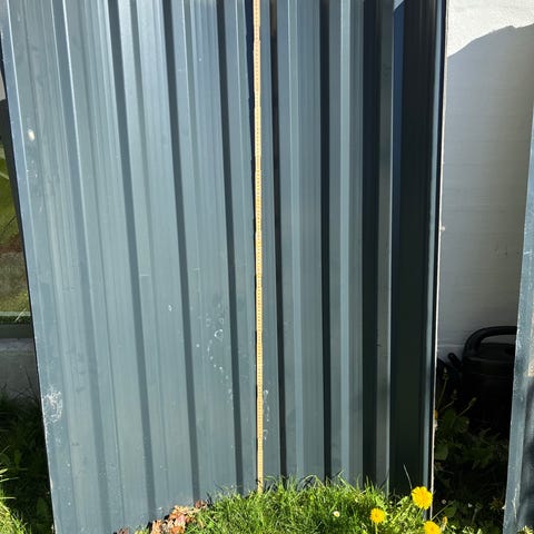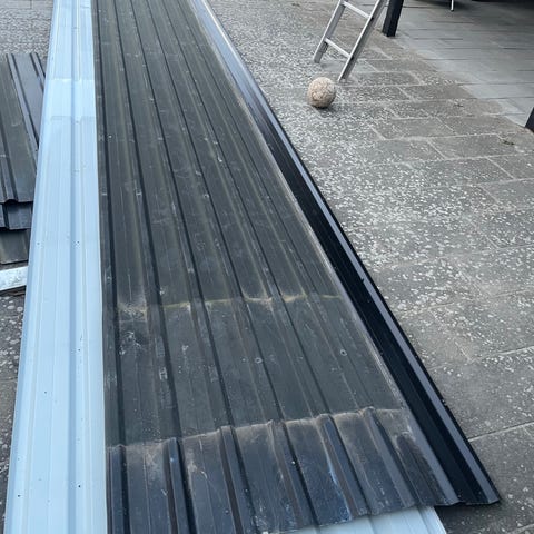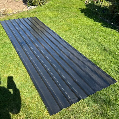Sort trapez tagplade i metal, god til fx skur eller overdækning. Ligger i haven som på billedet og er klar til at blive hentet og tilpasset i længde efter behov.