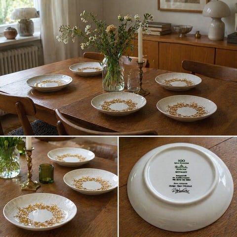 Disse tallerkener tilhører den berømte Rosenthal Christmas-serie, fremstillet i fin porcellæns og udsmykket af den danske designer Bjørn Wiinblad i 1970’erne og 80’erne. Hvert stykke illustrerer en scene fra juletraditionen med hans karakteristiske eventyrlige stil, kendetegnet ved farveivrige nuancer på en koboltblå baggrund og rige detaljer i ædelt guld. Ved bunden står fabrikationsoplysningerne.