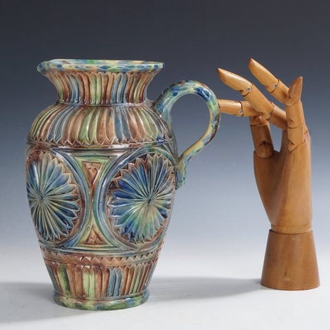 Keramikvase fra Tyskland, vintage 1970–1980, designet af Heinz Theo Dietz, blå glasur med lilla accentfarver og et stiliseret mælkebøtte-dekor langs siden, højde 33 cm, halsdiameter 4,5 cm, vægt ca. 1,6 kg, underskrevet på bunden med designerens monogram og nummeret 21. Klik på den blå "gå til varen" knap, for at købe eller byde på denne vare. Den samlede pris vil blive vist inden du afgiver dit bud.