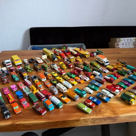 Gran parti af 200 køretøjer Hot Wheels og Matchbox, alle nye i deres blister original, uåbnet og uden folder. Samling meget varieret, med talrige Premium, Pop Culture, Fast & Furious, Car Culture, Pull‑Back, Matchbox under mærker, store sæt, playsets, 100 yderligere basismodeller og et licenseret ekstra unikt og meget sjældent 1-artikel.