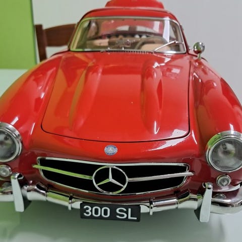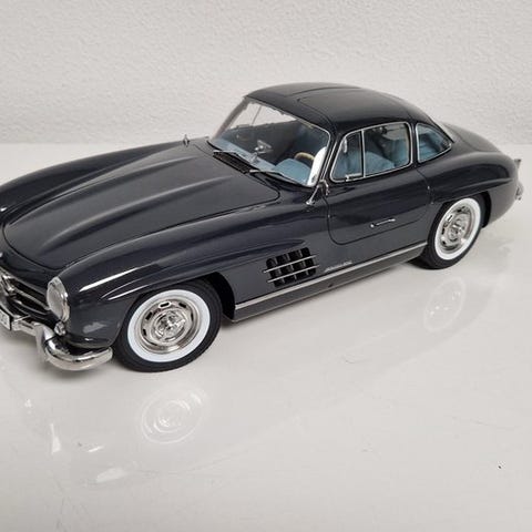 Eaglemoss Mercedes-Benz 300 SL Gullwing 1955 i skala 1:8, model i hvidmetallet metal, i meget god stand med en manglende sideskærm, en afbrudt men medfølgende wiper, en dør der ikke holder sig åben, og elektronik der ikke virker. Klik på den blå "gå til varen" knap, for at købe eller byde på denne vare. Den samlede pris vil blive vist inden du afgiver dit bud.