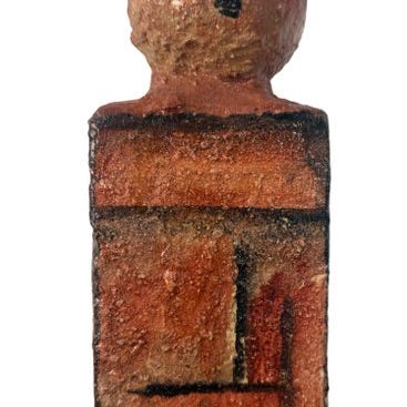 Figur stiliseret i terracotta, modelleret og delvist emaljeret, der forestiller en antropomorf figur med et skematiseret ansigt og en lang hals. Figuren har en cylindrisk krop, der hviler på en åben rektangulær base, muligvis et dekorativt element eller en lille figurativ vase.