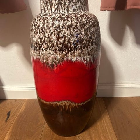 Scheurich gulvvase 402-44 fra Vesttyskland, 1970erne, Fat Lava glasur på fajans, brun og okker, højde 44 cm, bredde 22 cm, dybde 18 cm, diameter 18 cm, i fremragende stand med kun minimale brugsspor. Klik på den blå "gå til varen" knap, for at købe eller byde på denne vare. Den samlede pris vil blive vist inden du afgiver dit bud.