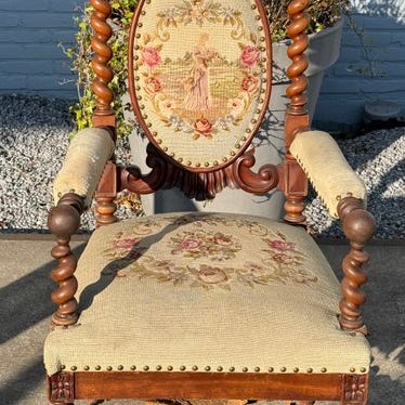 Elegant antik stol i Luigi Filippo-stil, fremstillet af massivt valnøddetræ med fornemme håndsnidede udskæringer. Topudformningen med motiver af akantusblade og volutter pryder den høje, slanke ryg, hvilket er et karakteristisk træk ved italiensk snedkeri i anden halvdel af det 19. århundrede.