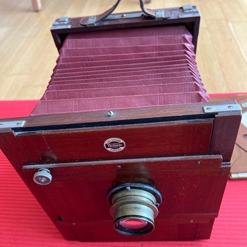 Dette er et tidligt træfelt-plade kamera, der anvender en sammenfoldelig foldeblænde-struktur. Det træangreb viser normale tegn på alder og brug, herunder ridser, patina og slid gennem årene.