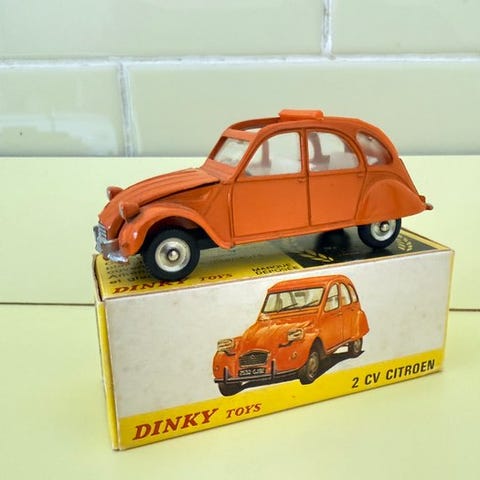 Original fransk 50+ år gammel Dinky-Toys Vespa 2CV 400 i meget pæn stand.