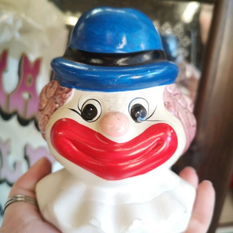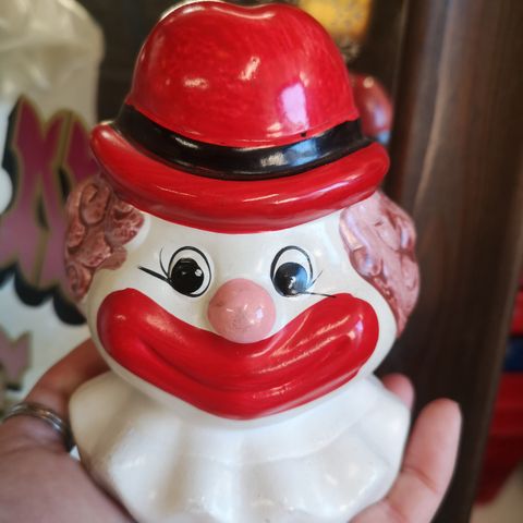 Opbevaring - klovn, Gammel Hjemis beholder, Super flot og skøn vintage Hjemis beholder. Fungerer som en dåse - hatten kan tages af. Højde 24 cm.