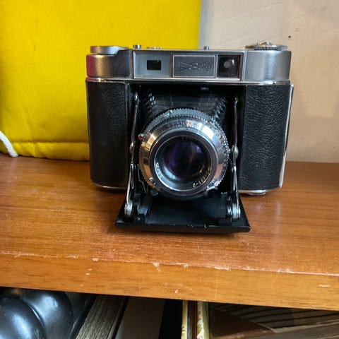 Kameraet leveres i sit polstrede læderetui og udstyret med en rem og en lille læderboks, der indeholder en solskærm og to filtre.