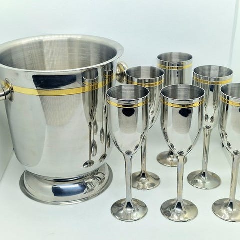 Rare Laurent-Perrier aluminiums champagnekøler, Frankrig, ca. 1930–1940, 22 cm høj og 20 cm i diameter, i fremragende, aldrig brugt stand. Klik på den blå "gå til varen" knap, for at købe eller byde på denne vare. Den samlede pris vil blive vist inden du afgiver dit bud.