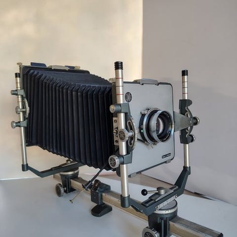 Linhof Super Technika III 9x12 specialudgave grå, filmformat 9x12 cm, serienummer 59615, fysisk tilstand: rimelig, funktionel tilstand: testet og funktionel. Klik på den blå "gå til varen" knap, for at købe eller byde på denne vare. Den samlede pris vil blive vist inden du afgiver dit bud.