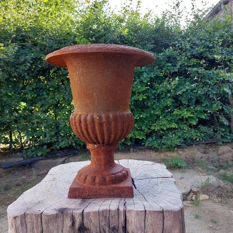 Jern dekorativt vase til have eller indendørs brug, dateret til anden halvdel af det 20. århundrede, 24 cm høj, 24 cm bred og 24 cm dyb, i god brugt stand med mindre aldersrelaterede spor. Klik på den blå "gå til varen" knap, for at købe eller byde på denne vare. Den samlede pris vil blive vist inden du afgiver dit bud.