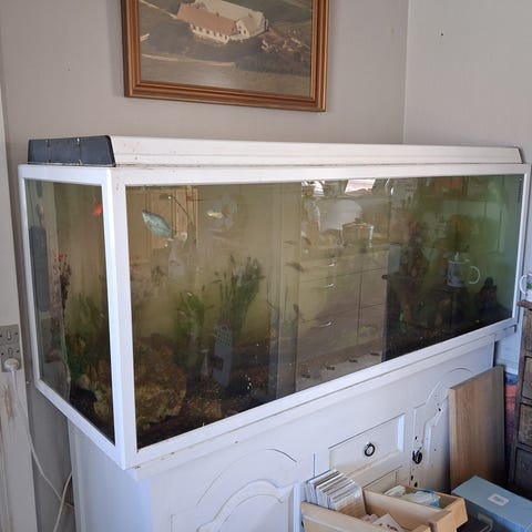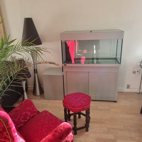 Et 450 liter akvarium med spandpumpe og varmelegeme næsten nyt lederlys og én store trærod og lavasten og lille pumpe med lidt kunstiplanter med lidt fisk mål på akvarium længte 1 meter brede 50 cm højte 85 cm og med underbor med to skabe 4100 kr