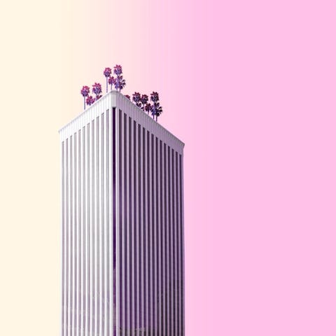 Dette fotografi blev tænkt, produceret og udført uden kunstig intelligens. Optaget i Palm Springs, Californien (marts 2019). Fra serien "Palm Springs" skaber Téber en ny struktur ud fra en eksisterende bygning beliggende i Palm Springs. Dette er udgaven "Purple".