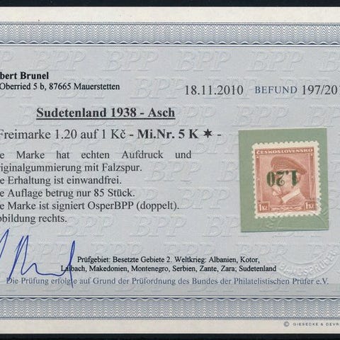 Asch, 20 øre med omvendt overstempel "1,20" fra Deutsche Besetzung II. Verdenskrig – Sudetenland, sjælden mint-præget (MH) med en oplag på kun 82 og dobbelt underskrevet af Krischke samt Fotobefund Brunel-certifikat der angiver, at det er echt & einwandfrei. Klik på den blå "gå til varen" knap, for at købe eller byde på denne vare. Den samlede pris vil blive vist inden du afgiver dit bud.