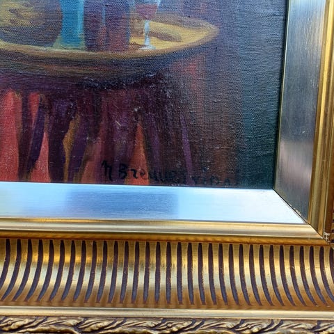 Maleri af kanalmotiv med kirketårn i guldramme