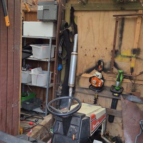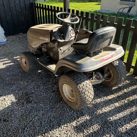 Maskinen er uden klippebord, og har noget rust i panelet ved fødderne, men den starter og kører. Skal dog have nyt batteri (jeg har et batteri, så du kan høre den starte).