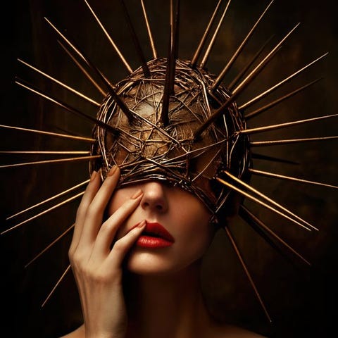 100% gennemført i KAMERA - modellen bar faktisk levende lys på hovedet og holdt en brændende bird of paradise-blomst i hånden (fastgjort med aftagelig klæbemiddel). Jeg er en kunstner, der forpligter mig til at skabe surrealisme, der er 100% fotografisk og ikke et resultat af Photoshop eller AI.